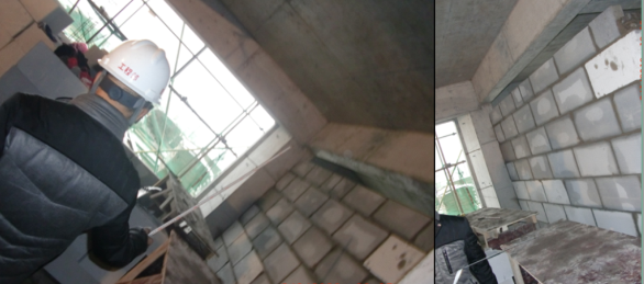 通過有醒目標志的安全通道,便走進了16號樓。工程管理部質(zhì)量主管王均家向大家依次介紹眼前的施工建筑,并對每一項建筑質(zhì)量做詳細介紹和認真點評。首先,映入大家眼簾是整樓的框剪結(jié)構(gòu),一眼望去,主體結(jié)構(gòu)墻、柱、梁皆是垂直平整,幾何尺寸規(guī)范,邊角方正,觀感度良好。