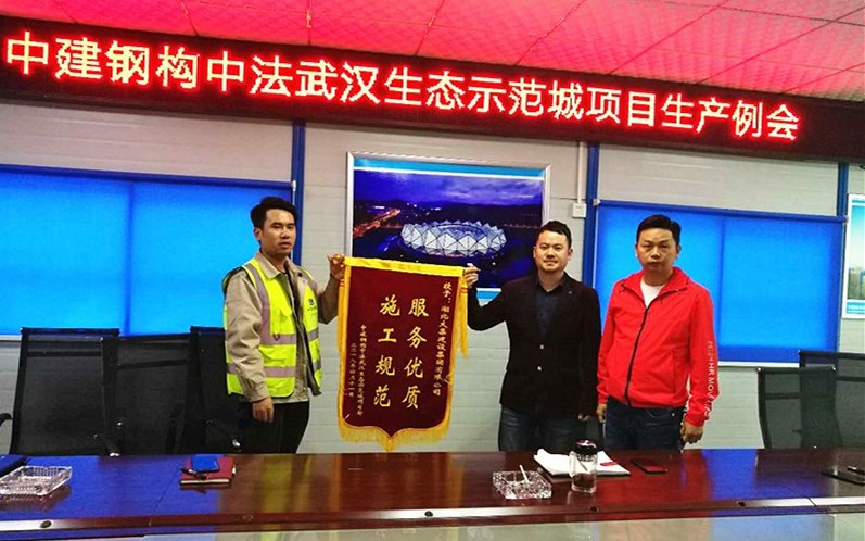 2018年4月13日,由集團公司參與承建的中法新城規(guī)劃館項目獲得中建鋼構嘉獎,授予“施工規(guī)范,服務優(yōu)質”的錦旗,項目經(jīng)理徐斌和工程部副部長陳超共同接受了這一榮譽。