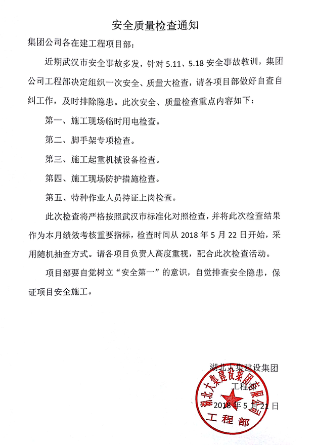 為進(jìn)一步貫徹落實(shí)集團(tuán)公司“安全生產(chǎn)重于泰山”的管理理念,5月21日,工程部下發(fā)質(zhì)量安全檢查通知,并成立質(zhì)量安全檢查組,自5月22日起隨機(jī)對集團(tuán)在建項(xiàng)目施工現(xiàn)場進(jìn)行安全檢查,嚴(yán)密排查施工現(xiàn)場的安全隱患,確保各項(xiàng)目安全施工工作順利開展。