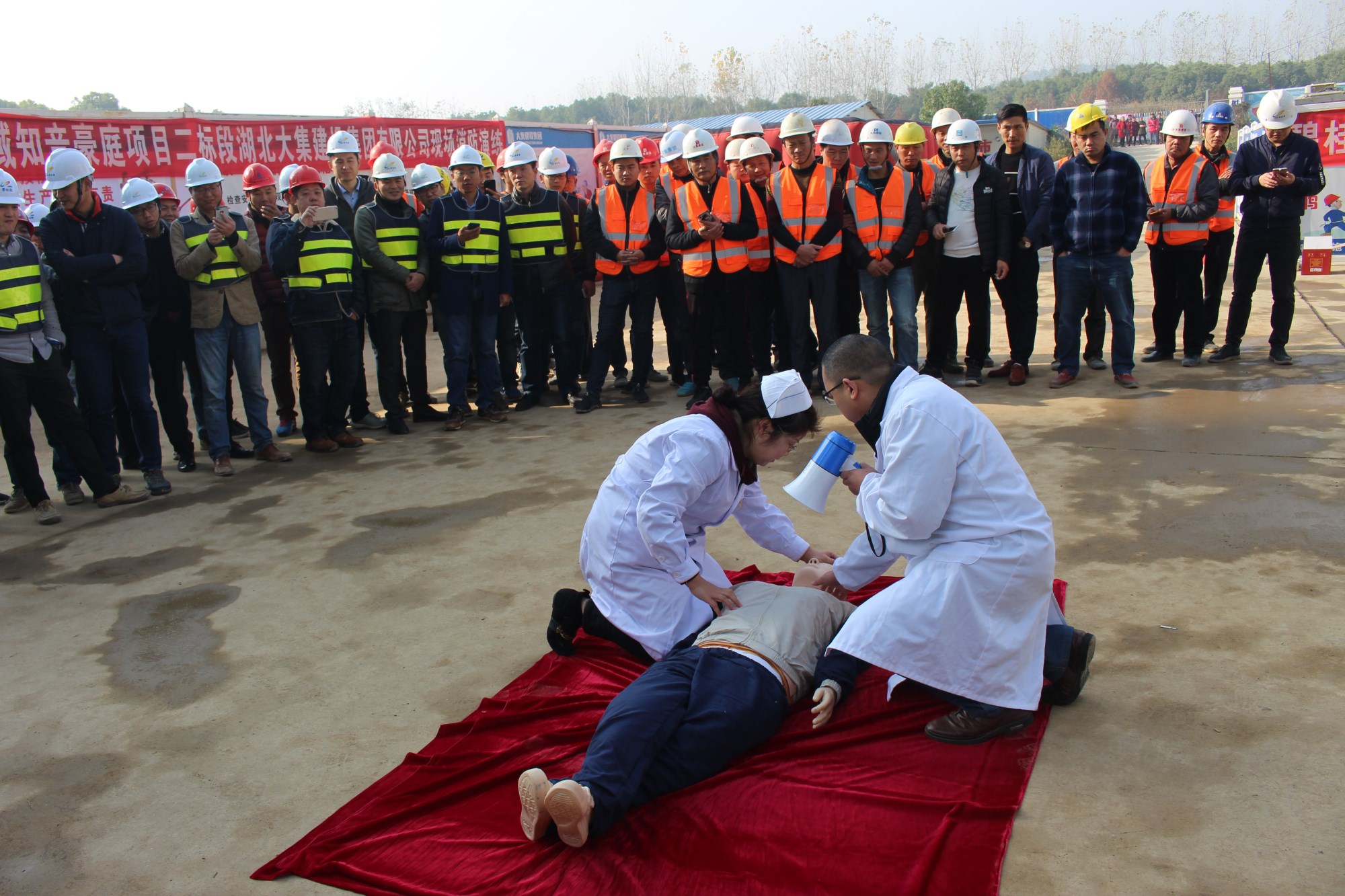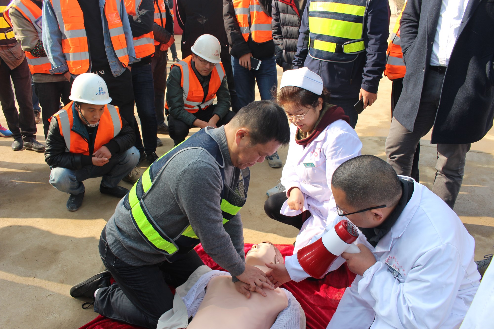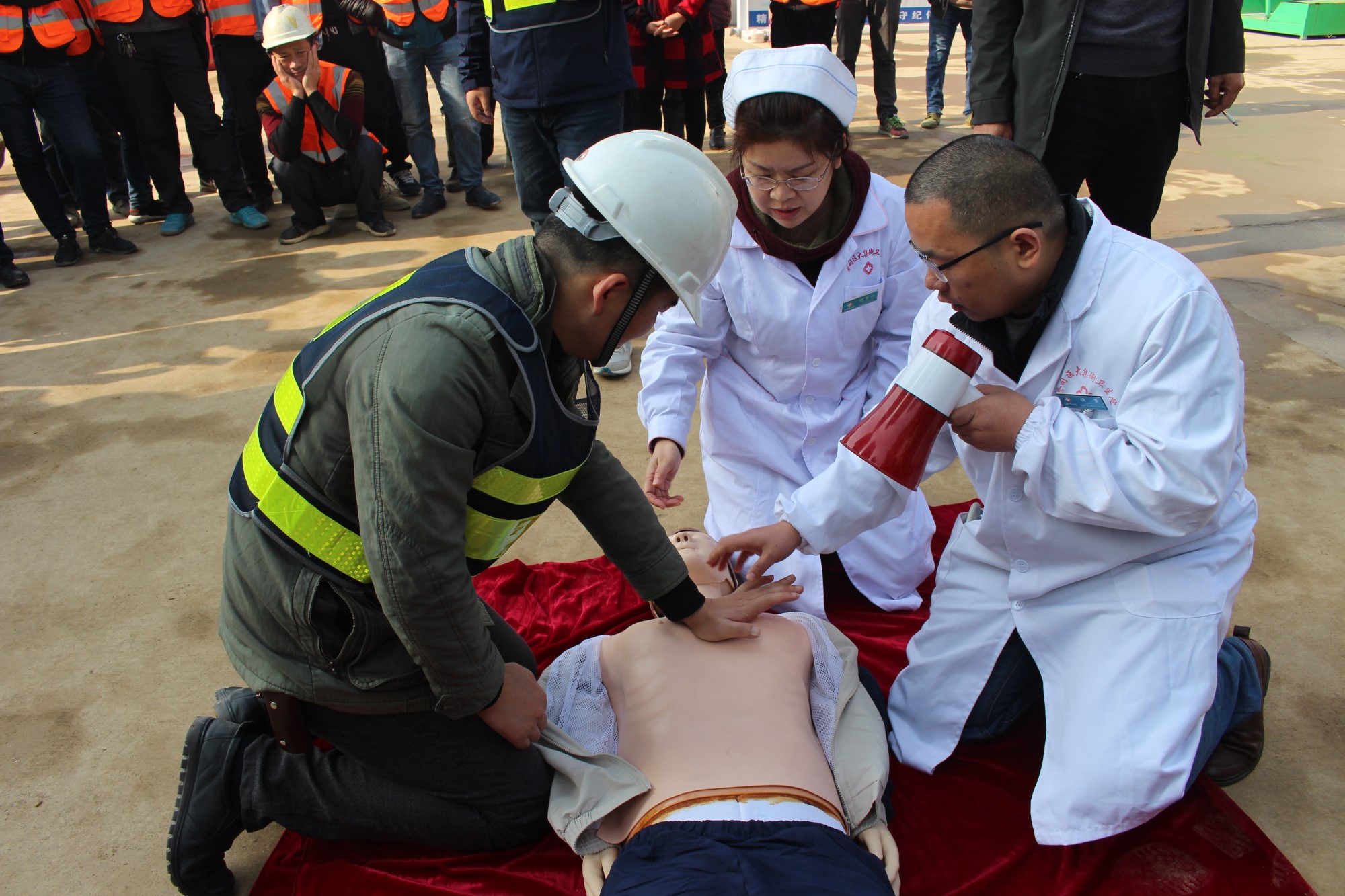 本次演習的第一個項目是心肺復蘇,由蔡甸區(qū)大集街衛(wèi)生院為現場參與人員講解,衛(wèi)生院醫(yī)生借助假人模型,生動形象地為大家講解了如何在現場進行心肺復蘇,強調了心肺復蘇的方法及要點。大家興趣濃厚,聽得認真,看得仔細,將 “心肺復蘇”要領熟記于心。講解結束后,衛(wèi)生院醫(yī)護人員還手把手指導大家進行實際操作,糾正錯誤的操作,并給予說明、講解和正確的示范。