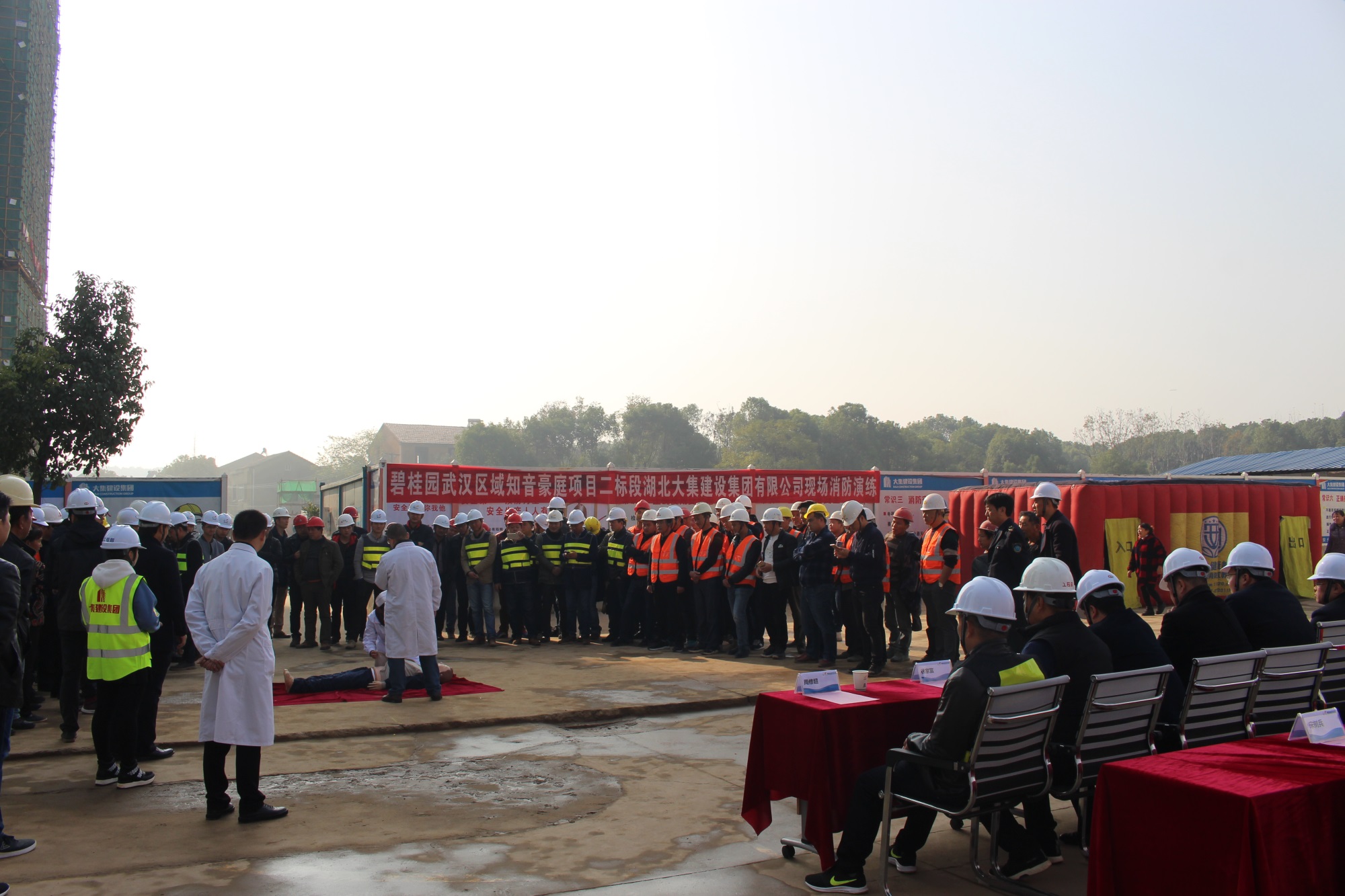蔡甸區(qū)建管站石進洲書記、周波站長、范真科長、宋樹兵科長,蔡甸區(qū)大集街道周修超主任,碧桂園武漢區(qū)域漢口片區(qū)執(zhí)行總裁屈宇宏、武昌片區(qū)執(zhí)行副總裁鄢瑞林、工程管理部副總經理葛志鵬、安全管理部副總經理吳家應、知音豪庭項目副總經理馮俊林,湖北大集建設集團副總經理徐家富等出席參加了此次消防演習活動。