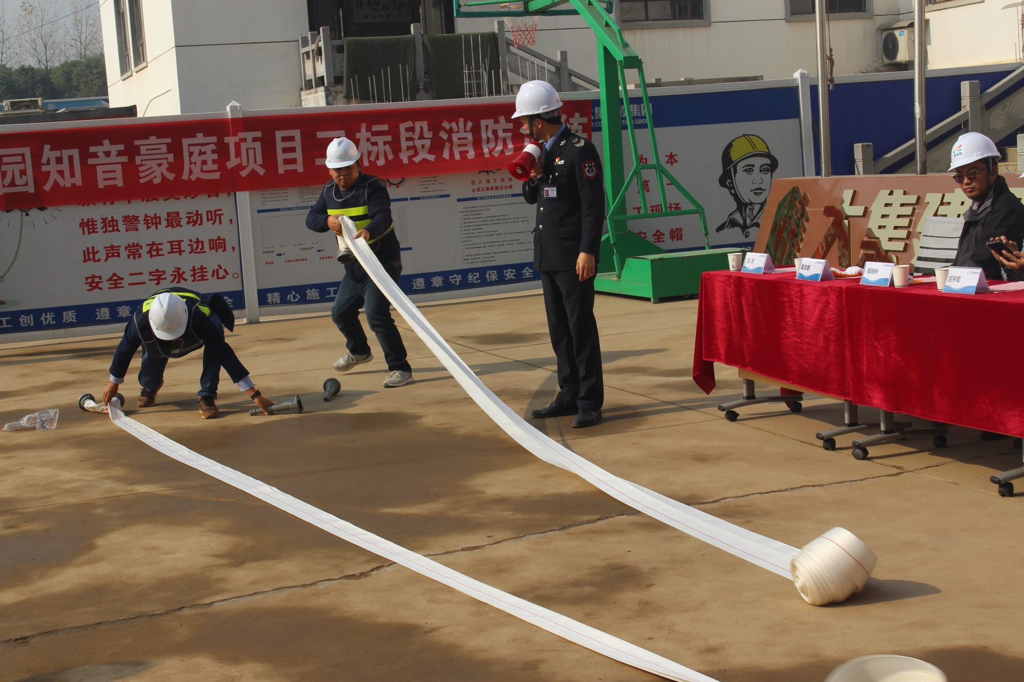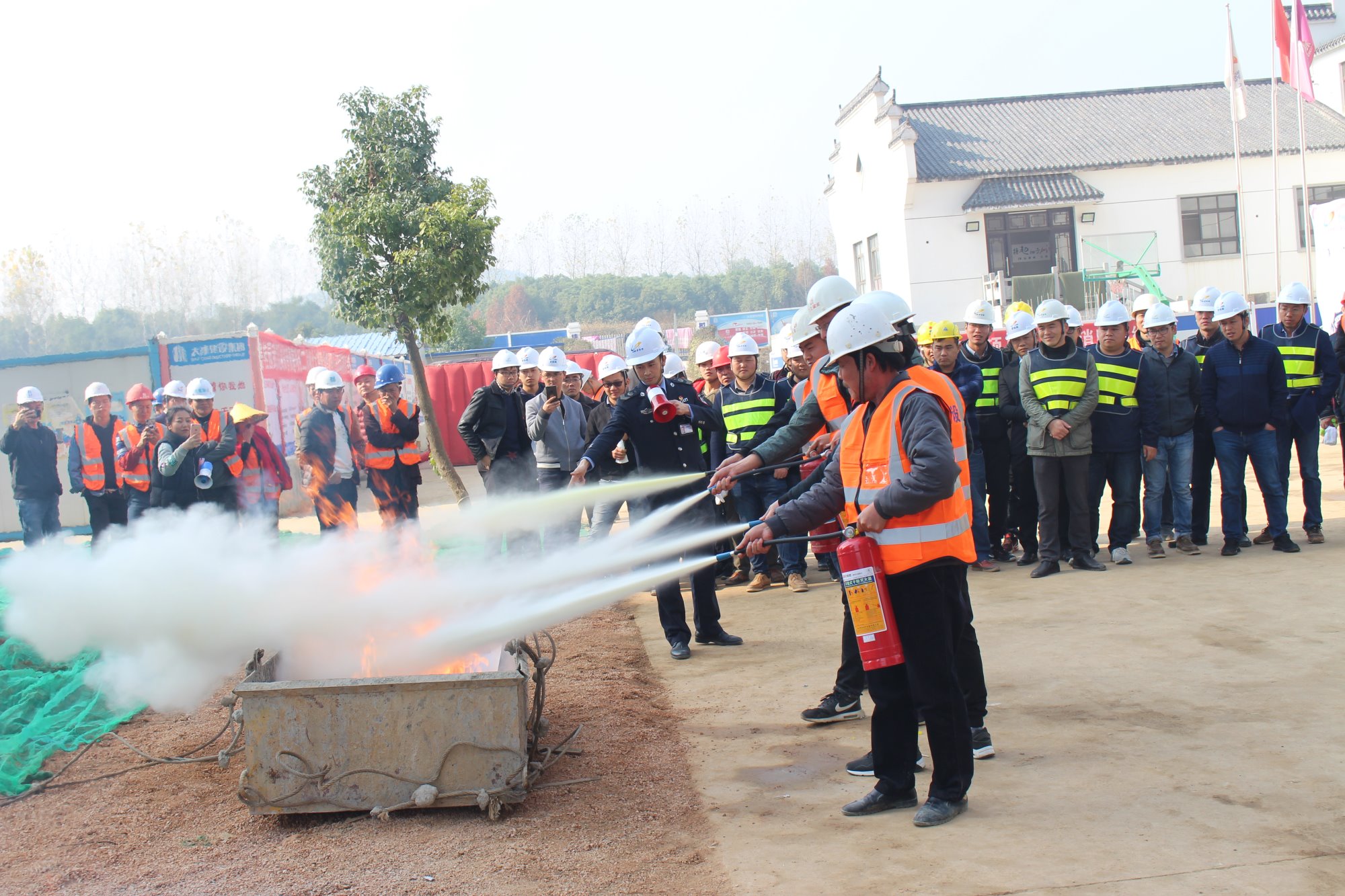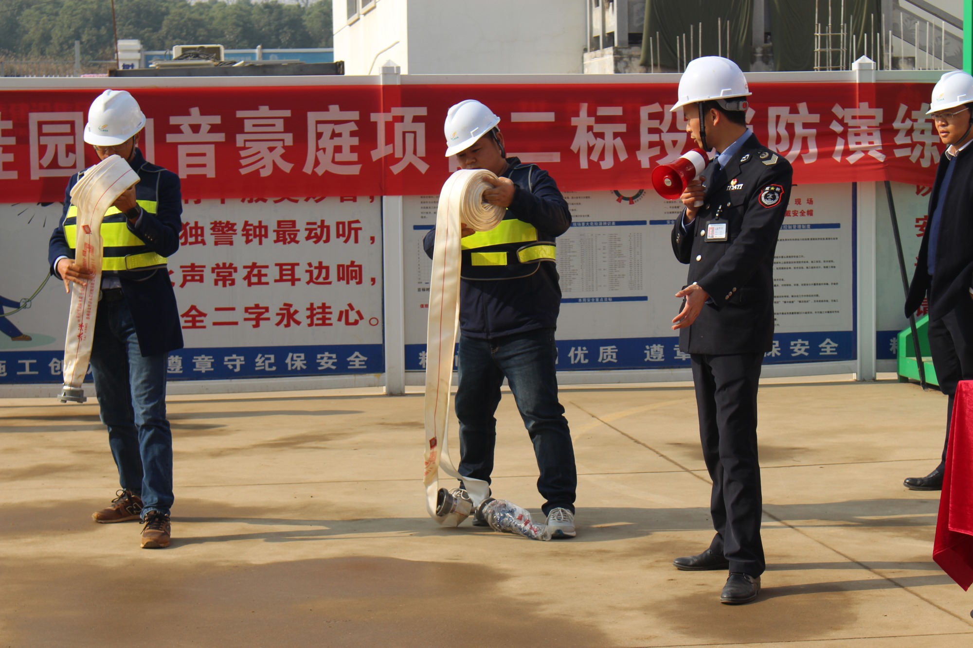 最后,王好主任為大家示范了滅火器的使用以及消防水帶的使用。他提到,滅火器是工程現場最常用的消防工具,滅火器使用過程中一定要確定火源完全撲滅,以防復燃情況發(fā)生。