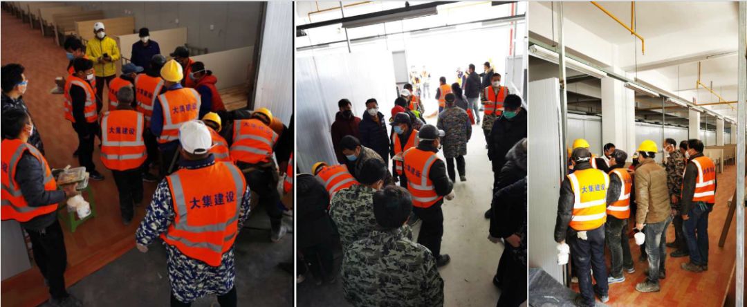 門外大雪紛飛,冰天雪地,屋內(nèi)緊張激烈,熱火朝天!針對人員不足、主材緊缺,施工隊伍難以調(diào)集,工期短,要求高,難度大等問題,董事長徐濤當(dāng)機立斷,現(xiàn)場成立施工指揮部,由他親任總指揮,項目經(jīng)理周偉任副總指揮,周勝書任施工總負責(zé),統(tǒng)籌現(xiàn)場大小事宜;張笠、裴行超、徐駿、汪勇、周峰、王洪波等項目經(jīng)理全體上陣,大家分工合作,細化施工圖紙,統(tǒng)籌施工組織,迅速形成一條集人員調(diào)配,材料供應(yīng),運輸保障,后勤服務(wù),財務(wù)支援等無縫對接的閉環(huán)作戰(zhàn)鏈條,大家相互支援,齊心協(xié)力,當(dāng)天便迅速組織起了包括泥工、木工、水電工、搬運、雜工等在內(nèi)的兩百多人的施工團隊,大量主材、輔料也陸續(xù)到位,各項工作開始緊張有序地開展,短短五天時間,湖北大集建設(shè)集團便圓滿完成施工任務(wù),為區(qū)指揮部交上一份完美的答卷,也向社會展示了公司專注、專業(yè)的大集速度!
