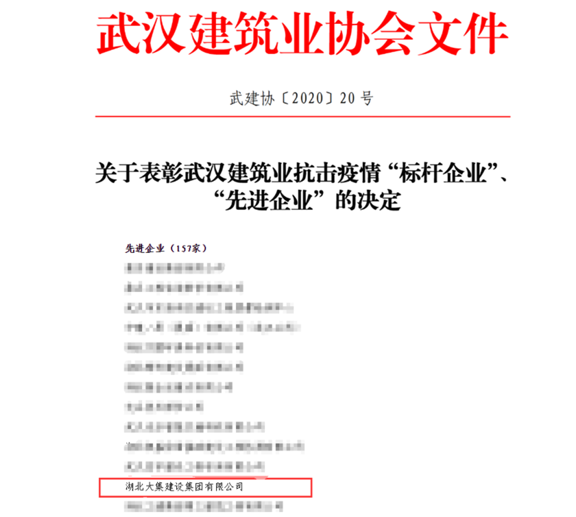 擔(dān)當(dāng)顯大愛 抗“疫”勇當(dāng)先 | 湖北大集建設(shè)集團(tuán)獲評(píng)武漢建筑業(yè)抗擊疫情“先進(jìn)企業(yè)”