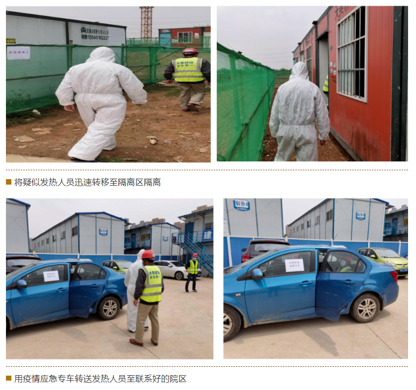 本次演練現(xiàn)場(chǎng)模擬一例疑似發(fā)熱患者,從被發(fā)現(xiàn)到應(yīng)急處理的全過(guò)程。演練內(nèi)容包括情況上報(bào)、項(xiàng)目應(yīng)急預(yù)案啟動(dòng)、緊急隔離、送醫(yī)、現(xiàn)場(chǎng)消毒等環(huán)節(jié)。整個(gè)演練過(guò)程緊張有序、防疫物資標(biāo)準(zhǔn)齊全、保障到位,參加演練人員反應(yīng)迅速、配合默契、職責(zé)明確,達(dá)到了預(yù)期效果。