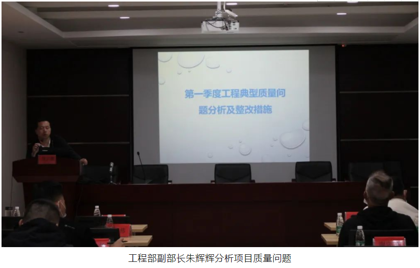 隨后,會(huì)議進(jìn)入質(zhì)量、安全隱患分析環(huán)節(jié),工程部副部長(zhǎng)朱輝輝及安全主管秦春波采用PPT通報(bào)問題的方式,照片配合講述,更直觀的把項(xiàng)目質(zhì)量、安全隱患問題展現(xiàn)在大家面前,朱工和秦工結(jié)合項(xiàng)目現(xiàn)場(chǎng)存在的質(zhì)量、安全問題,著重分析了問題產(chǎn)生的原因以及現(xiàn)場(chǎng)的安全管理情況,并逐一對(duì)各項(xiàng)目提出了相應(yīng)的整改措施。