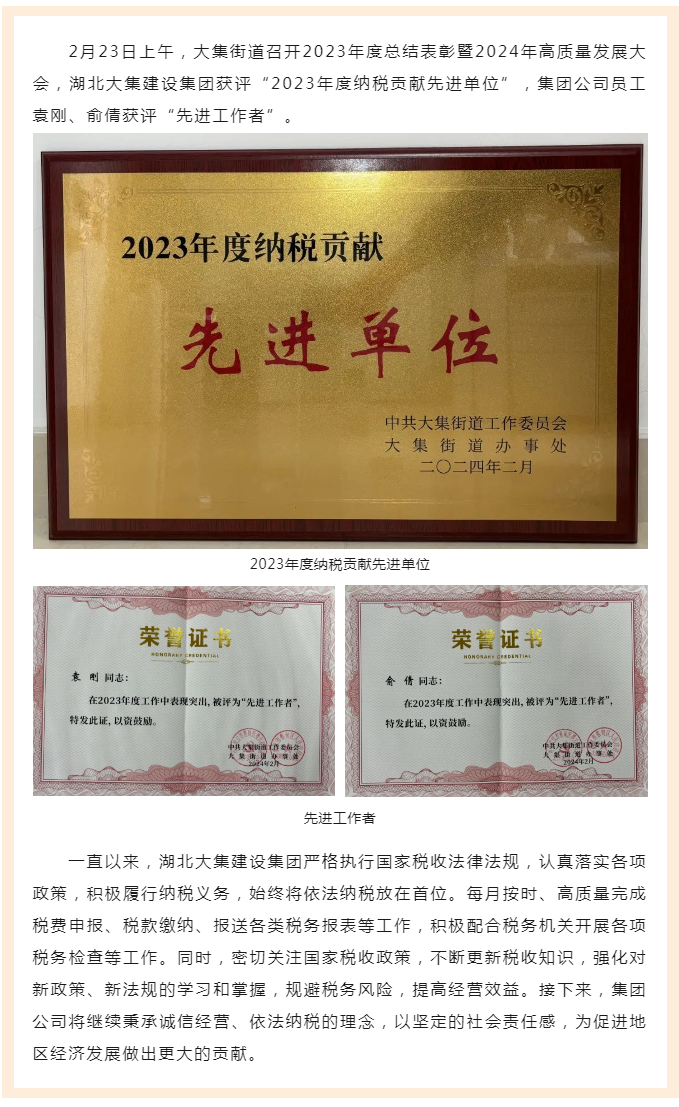 喜報!湖北大集建設(shè)集團(tuán)榮獲“2023年度納稅貢獻(xiàn)先進(jìn)單位”榮譽(yù)