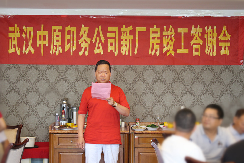 6月26日,武漢中原印務(wù)有限責(zé)任公司隆重舉行新廠(chǎng)房竣工答謝會(huì),集團(tuán)副總經(jīng)理徐家富、項(xiàng)目經(jīng)理田建新、招投標(biāo)部部長(zhǎng)胡鵬、財(cái)務(wù)部部長(zhǎng)鄧雪芬等受邀出席。