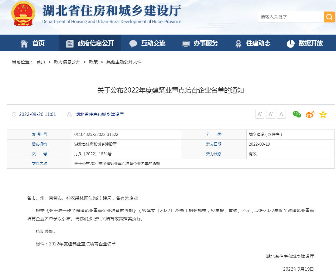920日,湖北省住房和城鄉(xiāng)建設(shè)廳網(wǎng)正式公布湖北省2022年度建筑業(yè)重點培育企業(yè)名單,湖北大集建設(shè)集團成功入選
