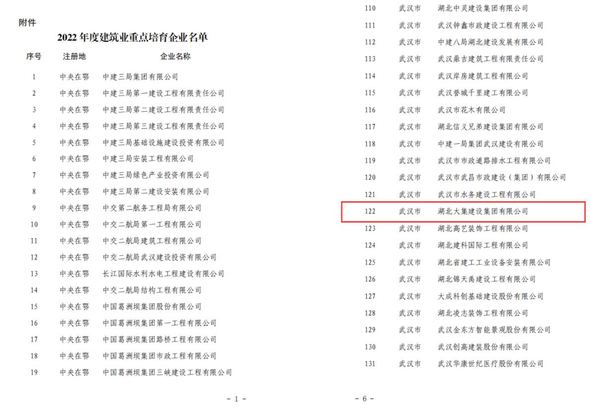 喜訊!湖北大集建設(shè)集團入選湖北省建筑業(yè)重點培育企業(yè)名單