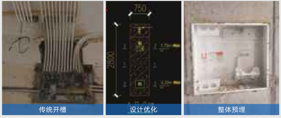 強(qiáng)弱電箱原圖紙?jiān)谄鲶w上開槽后埋線盒子,再進(jìn)行用砂漿修補(bǔ),這樣在工人施工過程中容易鑿斷或者震裂砌墻,后期修補(bǔ)因砂漿過厚也會(huì)引起面層開裂。為確保質(zhì)量,經(jīng)過設(shè)計(jì)優(yōu)化,增加構(gòu)造柱預(yù)埋線管及電箱,這樣不但解決開裂問題,加快了施工進(jìn)度,大大消除了質(zhì)量風(fēng)險(xiǎn)。